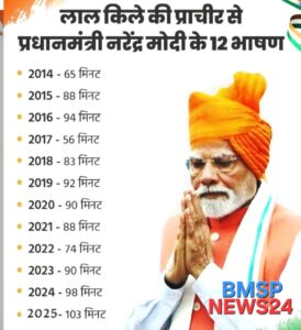 79वें स्वतंत्रता दिवस पर PM मोदी ने लाल किले पर लगातार 12वीं बार तिरंगा फहराया। इस दौरान उन्होंने 103 मिनट का भाषण दिया। यह अब तक के किसी भी प्रधानमंत्री का लाल किले से दिया सबसे लंबा भाषण है।