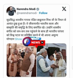 पीएम मोदी ने सोशल मीडिया पर पोस्ट में लिखा कि सुप्रसिद्ध शास्त्रीय गायक पंडित छन्नूलाल मिश्र जी के निधन से अत्यंत दुख हुआ है। वे जीवनपर्यंत भारतीय कला और संस्कृति की समृद्धि के लिए समर्पित रहे। उन्होंने शास्त्रीय संगीत को जन-जन तक पहुंचाने के साथ ही भारतीय परंपरा को विश्व पटल पर प्रतिष्ठित करने में भी अपना अमूल्य योगदान दिया। यह मेरा सौभाग्य है कि मुझे सदैव उनका स्नेह और आशीर्वाद प्राप्त होता रहा। साल 2014 में वे वाराणसी सीट से मेरे प्रस्तावक भी रहे थे। शोक की इस घड़ी में मैं उनके परिजनों और प्रशंसकों के प्रति अपनी गहरी संवेदना प्रकट करता हूं। ओम शांति!