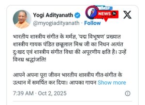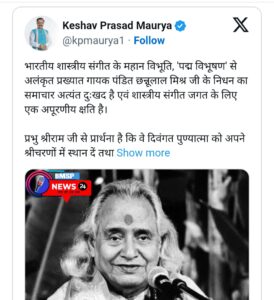उप मुख्यमंत्री केशव प्रसाद मौर्या ने अपने एक्स हैंडल से पंडित छन्नूलाल मिश्र जी के निधन की शास्त्रीय संगीत की दुनिया का अपूर्णीय क्षति बताया और भावभीनी श्रद्धांजलि दी।