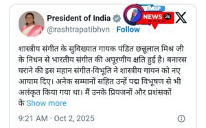 महामहिम राष्ट्रपति द्रौपदी मुर्मू जी ने अपने एक्स हैंडिल से शास्त्रीय संगीत के पुरौधा पंडित मिश्र जी को दी भावभीनी श्रद्धांजलि। पंडित मिश्र को भारतीय शास्त्रीय संगीत का एक मशालवाहक माना जाता था और वे इस शैली को भारत और उसके बाहर के श्रोताओं के लिए और अधिक सुलभ बनाने के लिए जाने जाते थे। भारतीय कला और संस्कृति में उनके योगदान को संगीत प्रेमियों और आम जनता, दोनों ने स्वीकार किया है। छन्नूलाल मिश्र के निधन पर देशभर से श्रद्धांजलि अर्पित की जा रही हैं।